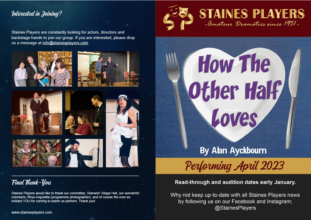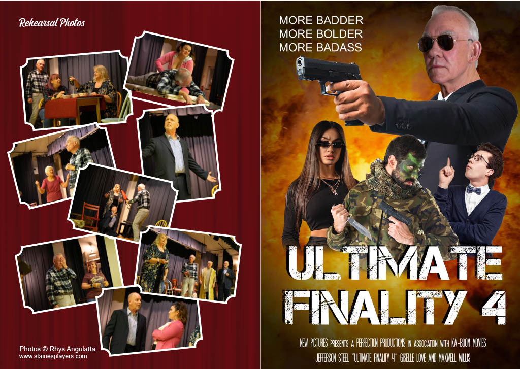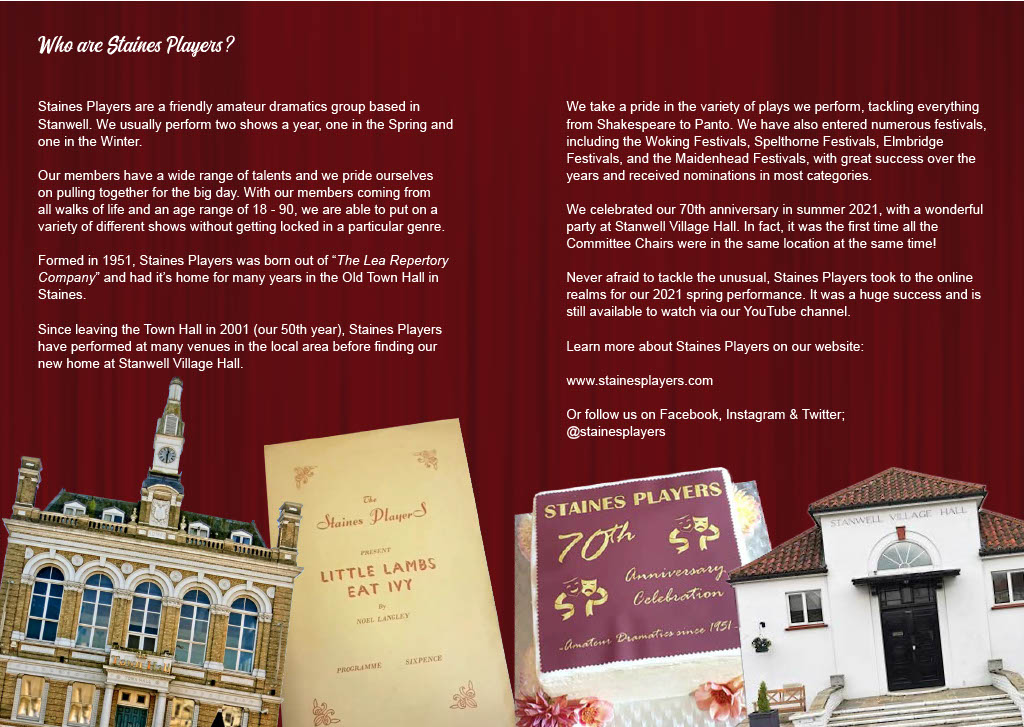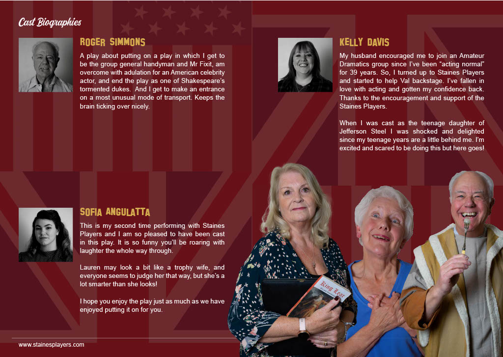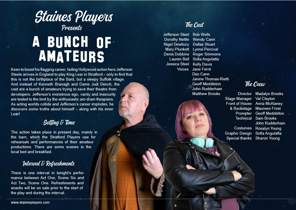 Keen to boost his flagging career, fading Hollywood action hero Jefferson Steele arrives in England to play King Lear in Stratford – only to find that this is not the birthplace of the Bard, but a sleepy Suffolk village. And instead of Kenneth Branagh and Dame Judi Dench, the cast are a bunch of amateurs trying to save their theatre from developers. Jefferson’s monstrous ego, vanity and insecurity are tested to the limit by the enthusiastic am-dram thespians. As acting worlds collide and Jefferson’s career implodes, he discovers some truths about himself – along with his inner Lear! Cast and Crew Jefferson Steele - Bob Wells Dorothy Nettle - Wendy Cann Mary Plunkett - Lynne Percival Lauren Bell - Sofia Angulatta Denis Dobbins - Roger Simmons Nigel Dewbury - Dallas Stuart Jessica Steel - Kelly Davis Voices - Jane Ferre, Des Cann, Janine Thomas-Rietti, Geoff Meddleton, John Rudderham, Matthew Brooks Director - Madalyn Brooks Stage Manager - Val Clayton Front of House & Backstage - Anna Mcalaney, Maureen Frost Prompt - Geoff Meddleton Technical - Sam Brooks Costumes - Rosalyn Young Graphic Design - Sofia Angulatta Special thanks - Sharon Young |