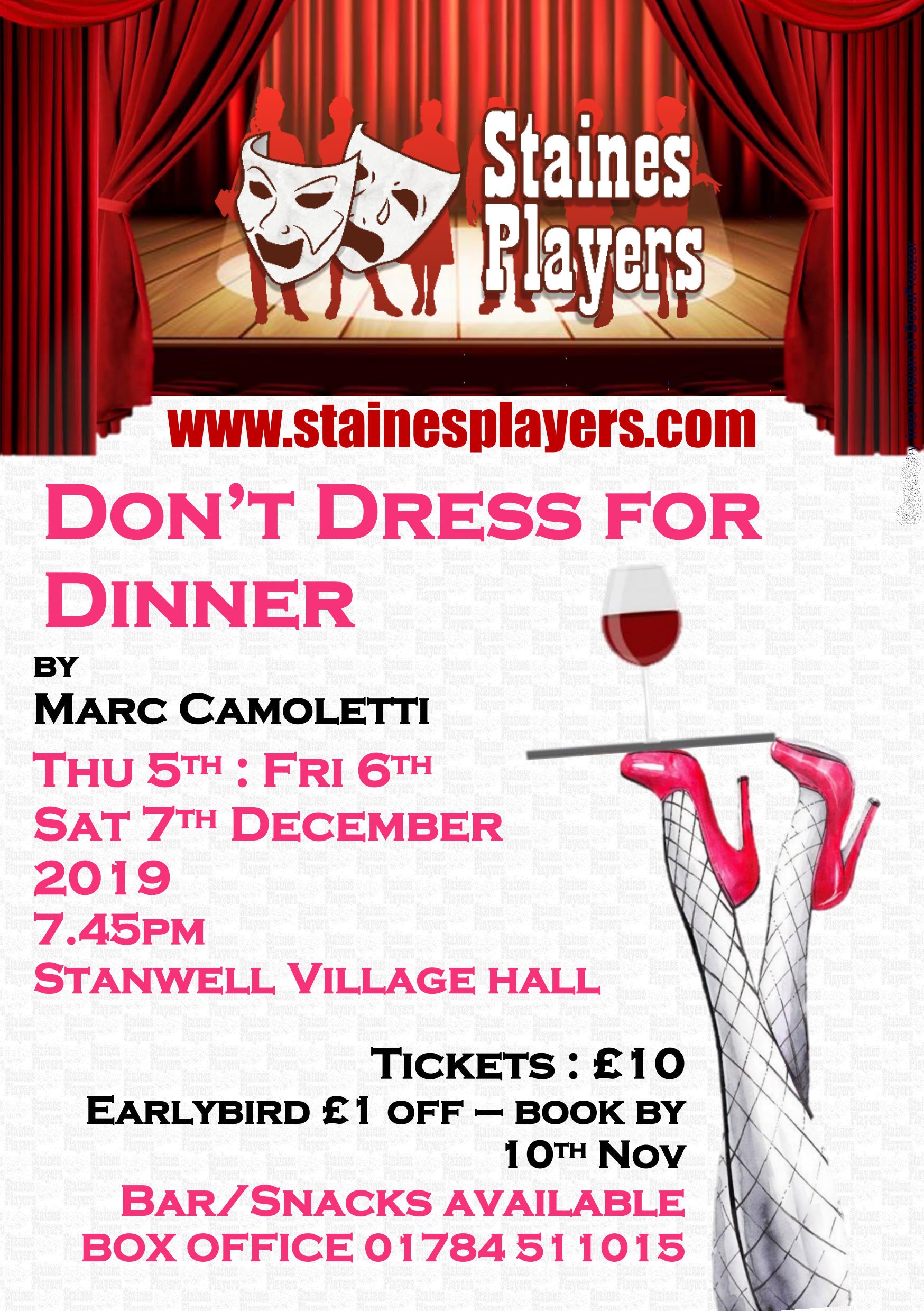 Bernard is planning a romantic weekend with his chic Parisian mistress in his charming converted French farmhouse, whilst his wife, Jacqueline, is away. He has arranged for a cordon bleu cook to prepare gourmet delights, and has invited his best friend, Robert, along too to provide the alibi. It's foolproof; what could possibly go wrong? Well.... suppose Robert turns up not realizing quite why he has been invited. Suppose Robert and Jacqueline are secret lovers, and consequently determined that Jacqueline will NOT leave for the weekend. Suppose the cook has to pretend to be the mistress and the mistress is unable to cook. Suppose everyone's alibi gets confused with everyone else's. Cast Bernard - Bob Wells Jacqueline - Madalyn Brooks Robert - Des Cann Suzette - Jane Ferré Suzanne - Janine Thomas-Rietti George - Tom Brierley Crew Director - Wendy Cann Assistant - Maureen Frost Stage Manager - Lynne Percival Assistant Stage Manager - Sofia Sanchez-Langton Set Construction - Dallas Stuart, James Henry, Cast & Crew Sound & Lighting - Sam Brooks Prompt - Geoff Middleton Social Media - Amanda Stuart Programme & Posters - Maureen Frost |