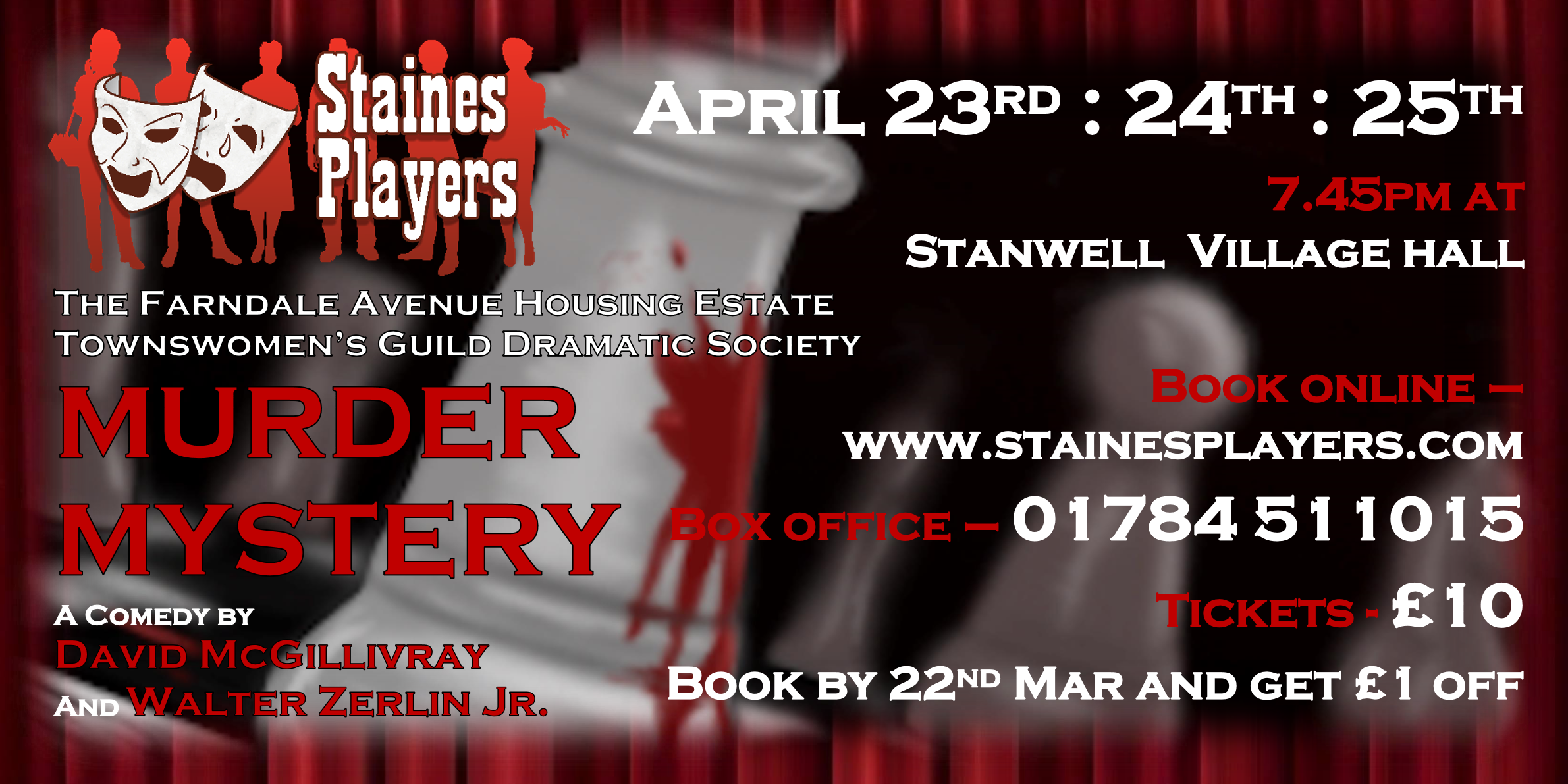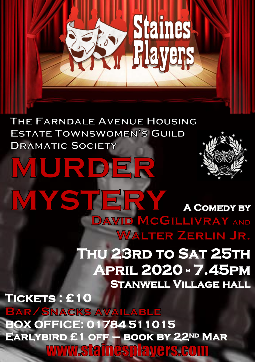 The Farndale Avenue Housing Estate Townswomen’s Guild Dramatic Society decide to put on a murder mystery play. They consider themselves to be more adventurous than the Old Vic or the RSC so what could possibly go wrong? Judging by the events that take place during the play, just about everything! Bits of the scenery collapse, cues are missed, lines are forgotten and the lighting and sound effects are….well strange. If the cunning whodunit is not enough, there is also a film, a fashion show and a Murder Mystery Quiz (complete with prize). The indomitable Mrs Reece, who chairs the Group, is constantly at hand to keep everything going, including having to manage an alternative ending when the ‘murderer’, about to be revealed, has to rush home due to a domestic incident! This play-within-a-play creates some amazing comic moments that provides brilliant entertainment. Cast Mrs Reece - Wendy Cann Thelma - Joanne Cronk Audrey - Janine Thomas-Rietti Felicity - Lynne Percival Gordon - James Henry Crew Director - Rosalyn Young Prompt - Geoff Meddleton Set Construction - Dallas Stuart, Guido Rhetti, James Henry, Cast & Crew Sound & Lighting - Dallas Stuart Backstage Hands - Val Clayton, Roger Simmons, Anna McAlaney Social Media, Programme & Posters - Sofia Angulatta With thanks to - Madalyn Brooks, Sam Brooks & Rhys Angulatta |