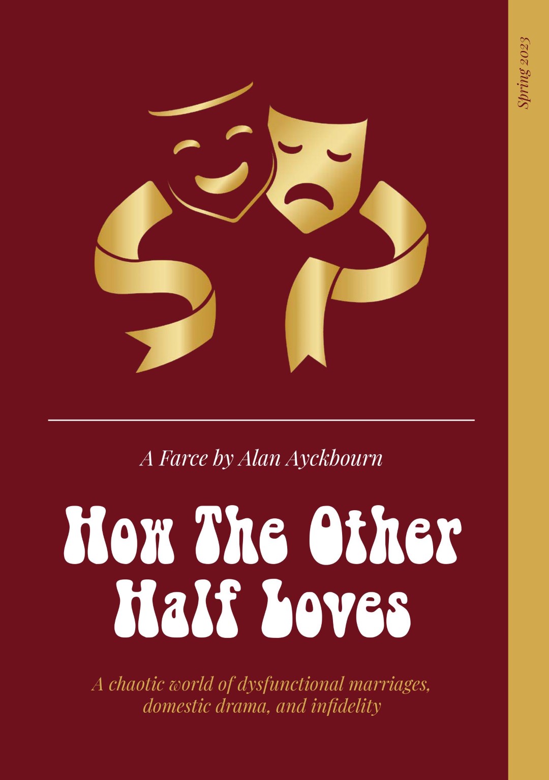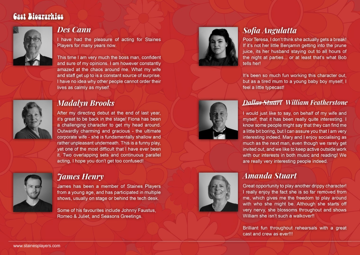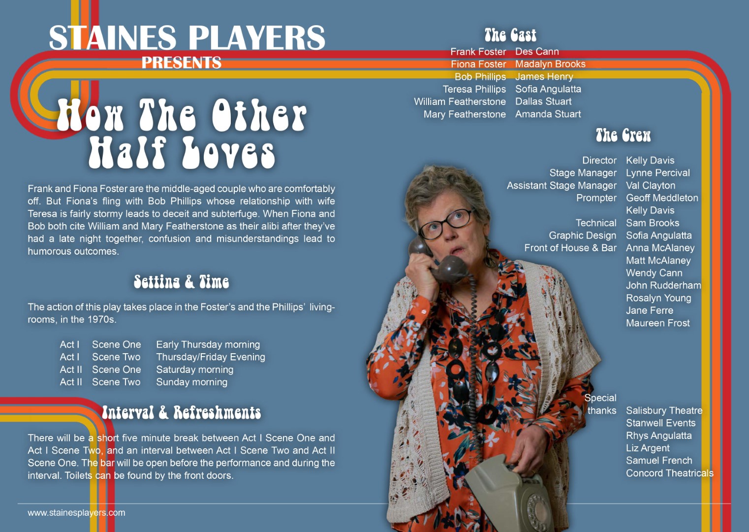 A hilarious farce by Alan Ayckbourn Three couples. Two dining rooms. One big mess. Alan Ayckbourn’s classic comedy takes us into a chaotic world of dysfunctional marriages, domestic drama, and infidelity. The lives of three couples frantically intertwine in this classic Ayckbourn comedy of confusion and chaos. When one of the women arrives home suspiciously late one night, a chain of events unfolds drawing each of the couples ever deeper into hilarious misunderstanding. Cast and Crew Frank Foster - Des Cann Fiona Foster - Madalyn Brooks Bob Phillips - James Henry Teresa Phillips - Sofia Angulatta William Featherstone - Dallas Stuart Mary Featherstone - Amanda Stuart Director - Kelly Davis Stage Manager - Lynne Percival Assistant Stage Manager - Val Clayton Prompt - Geoff Meddleton & Kelly Davis Technical - Sam Brooks Front of House & Backstage - Anna Mcalaney, Matt McAlaney, Wendy Cann, John Rudderham, Rosalyn Young, Jane Ferre, Maureen Frost Graphic Design - Sofia Angulatta Special thanks - Salisbury Theatre, Stanwell Events, Rhys Angulatta, Liz Argent, Samuel French, Concord Theatricals |