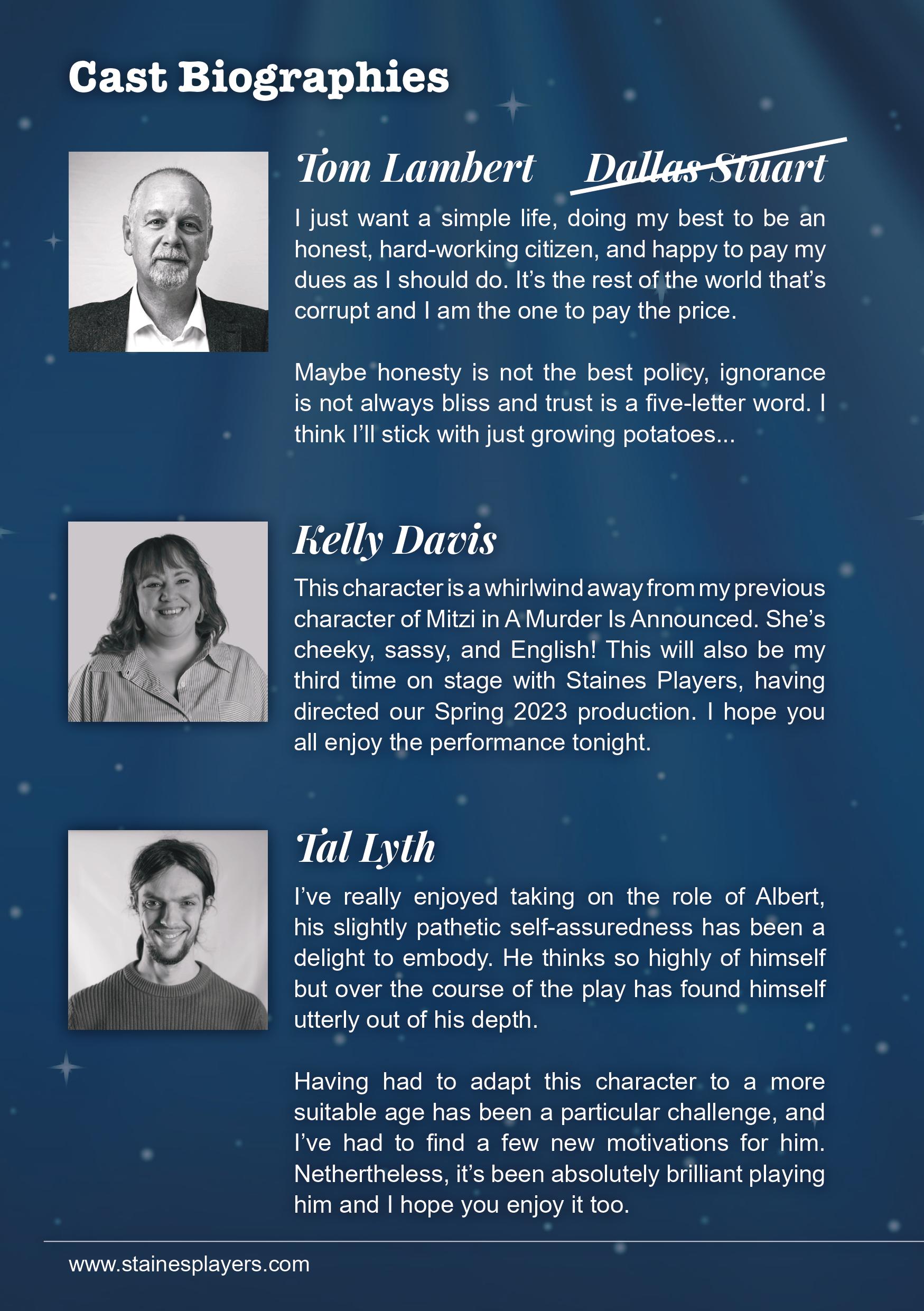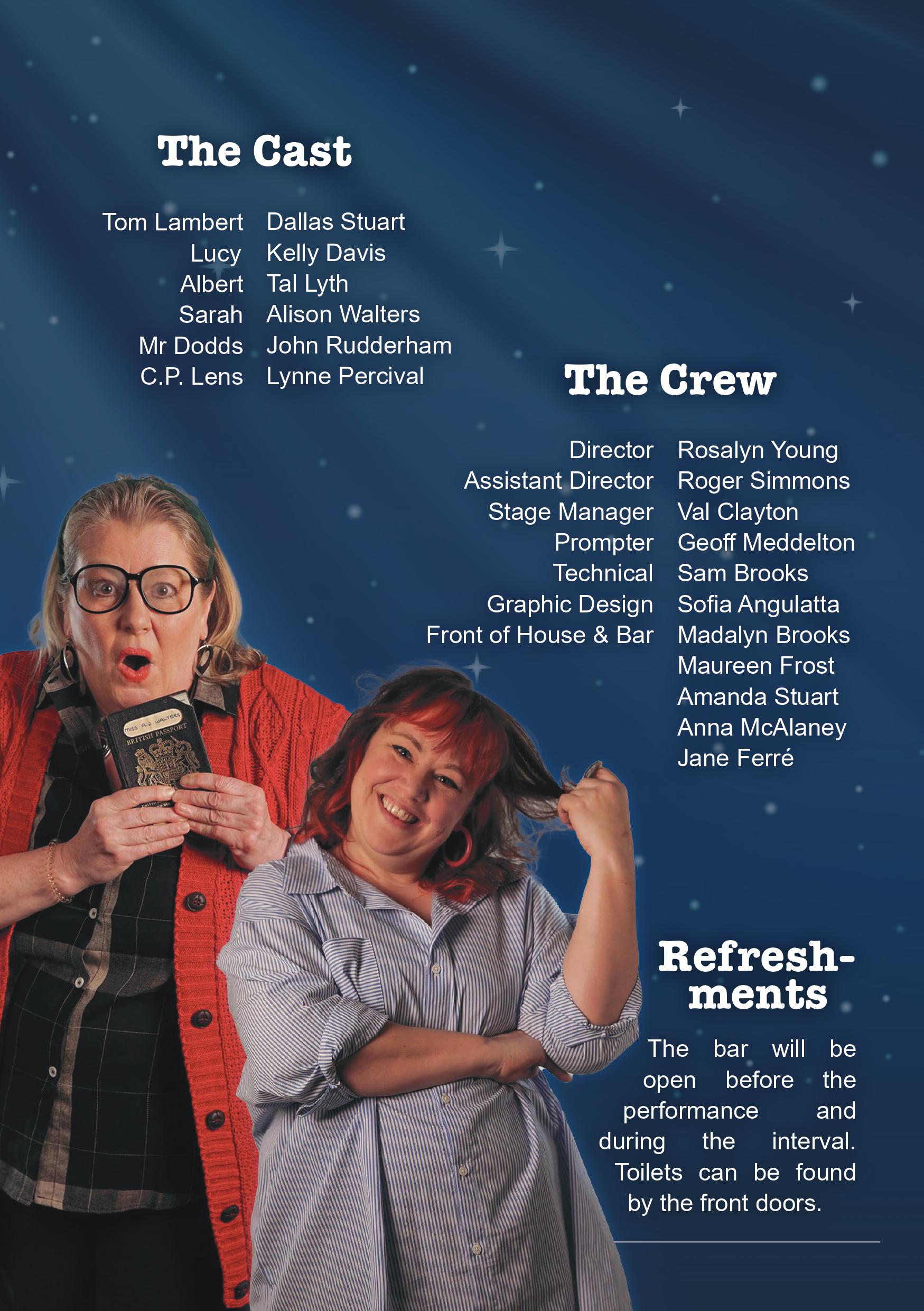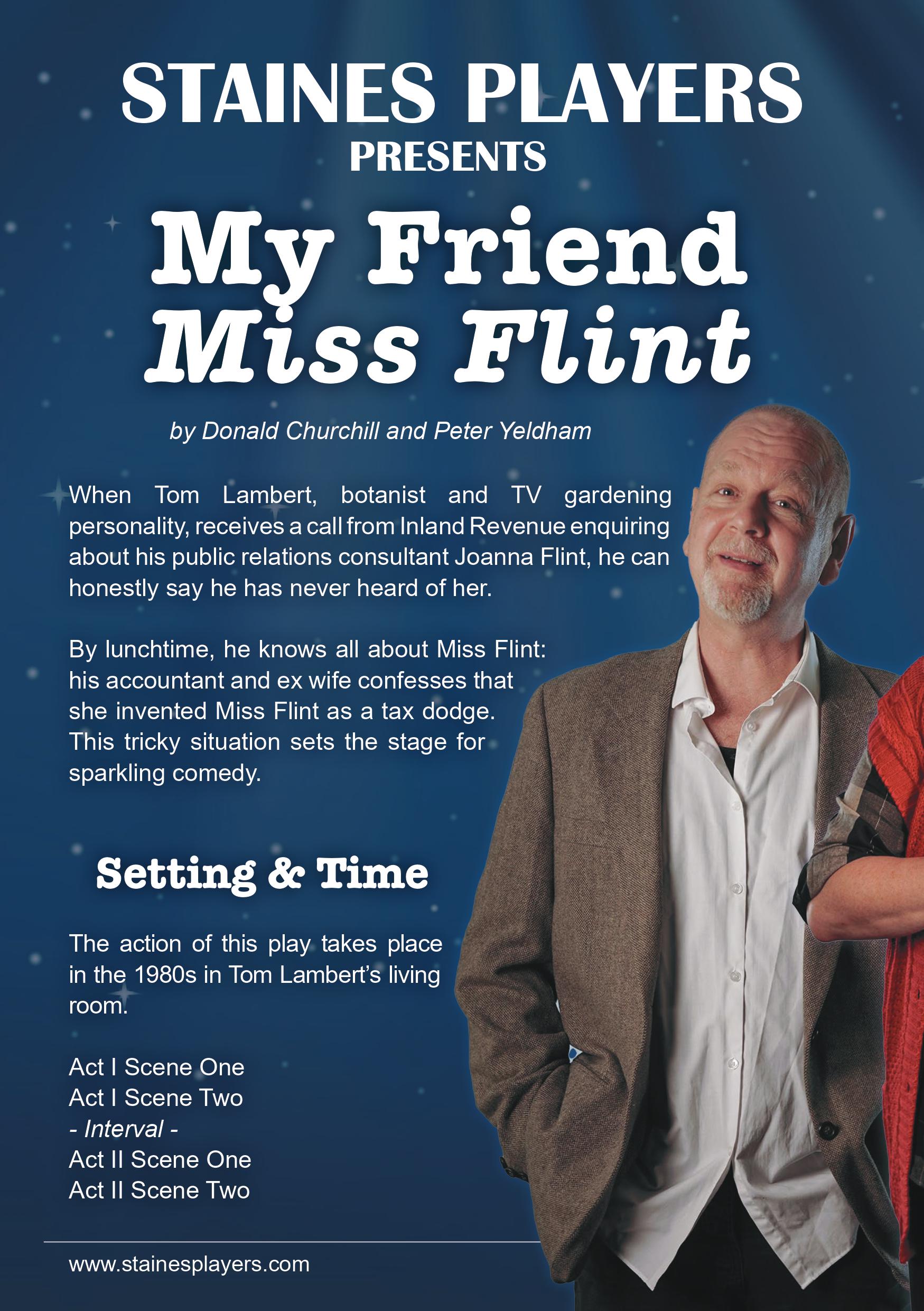 A comedy by Donald Churchill and Peter Yeldham When Tom Lambert, botanist and TV gardening personality, receives a call from Inland Revenue enquiring about his public relations consultant Joanna Flint, he can honestly say he has never heard of her. By lunchtime, he knows all about Miss Flint: his accountant and ex wife confesses that she invented Miss Flint as a tax dodge. This tricky situation sets the stage for sparkling comedy. Cast and Crew Tom Lambert - Dallas Stuart Lucy - Kelly Davis Albert - Tal Lyth Sarah - Alison Walters Mr Dodds - John Rudderham C.P. Lens - Lynne Percival Director - Rosalyn Young Assistant Director - Roger Simmons Stage Manager - Val Clayton Prompt - Geoff Meddleton Technical - Sam Brooks Graphic Design - Sofia Angulatta Front of House & Bar - Madalyn Brooks, Maureen Frost, Amanda Stuart, Anna Mcalaney, Jane Ferre |