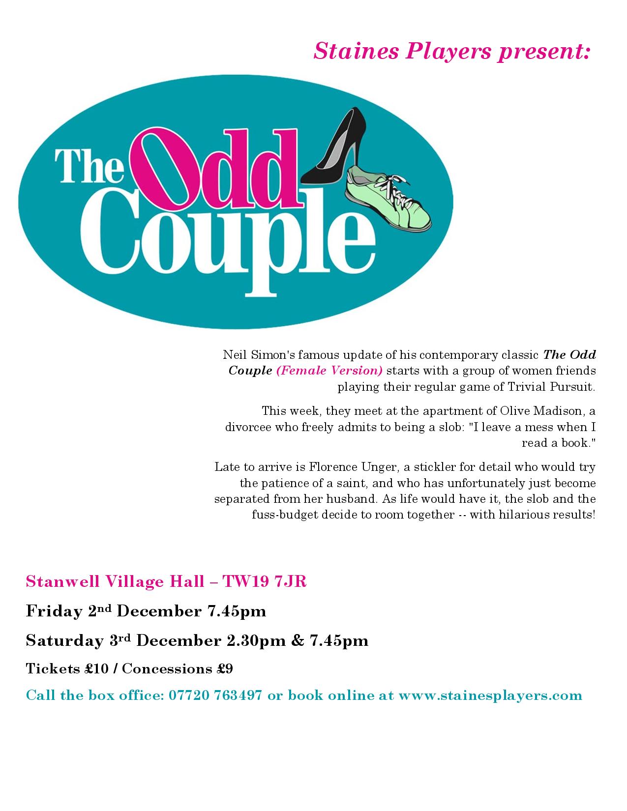 Neil Simon's famous update of his contemporary classic starts with a group of women friends playing their regular game of Trivial Pursuit. This week, they meet at the apartment of Olive Madison, a divorcee who freely admits to being a slob: "I leave a mess when I read a book." Late to arrive is Florence Unger, a stickler for detail who would try the patience of a saint, and who has unfortunately just become separated from her husband. As life would have it, the slob and the fuss-budget decide to room together -- with hilarious results! Within days, Florence's obsessive habits start taking their toll on Olive and their friends. The only remedy Olive can think of (a pair of brothers from Barcelona) disastrously backfires, and the two women are forced to agree on one thing -- even the best of friends sometimes make the worst of roommates. | Cast and Crew Mickey - Rosalyn Young Renee - Sophie Gunn Vera - Lynne Percival Sylvie - Janine Thomas-Rietti Olive Madison - Maureen Frost Florence Unger - Wendy Cann Manolo Costazuela - Des Cann Jesus Costazuela - Dallas Stuart Director - Val Clayton Stage Manager - Amanda Stuart Prompt - Geoff Meddelton Sound & Lighting - Dallas Stuart Publicity - Amanda Stuart Programme - Maureen Frost |