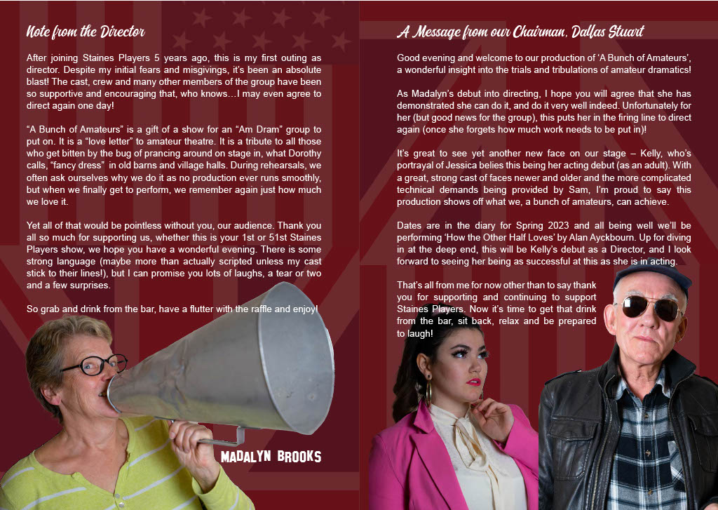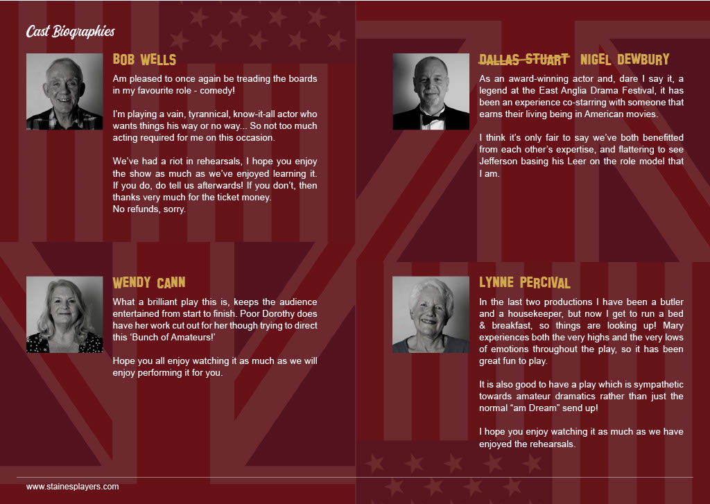 Keen to boost his flagging career, fading Hollywood action hero Jefferson Steele arrives in England to play King Lear in Stratford – only to find that this is not the birthplace of the Bard, but a sleepy Suffolk village. And instead of Kenneth Branagh and Dame Judi Dench, the cast are a bunch of amateurs trying to save their theatre from developers. Jefferson’s monstrous ego, vanity and insecurity are tested to the limit by the enthusiastic am-dram thespians. As acting worlds collide and Jefferson’s career implodes, he discovers some truths about himself – along with his inner Lear! Cast and Crew Jefferson Steele - Bob Wells Dorothy Nettle - Wendy Cann Mary Plunkett - Lynne Percival Lauren Bell - Sofia Angulatta Denis Dobbins - Roger Simmons Nigel Dewbury - Dallas Stuart Jessica Steel - Kelly Davis Voices - Jane Ferre, Des Cann, Janine Thomas-Rietti, Geoff Meddleton, John Rudderham, Matthew Brooks Director - Madalyn Brooks Stage Manager - Val Clayton Front of House & Backstage - Anna Mcalaney, Maureen Frost Prompt - Geoff Meddleton Technical - Sam Brooks Costumes - Rosalyn Young Graphic Design - Sofia Angulatta Special thanks - Sharon Young |