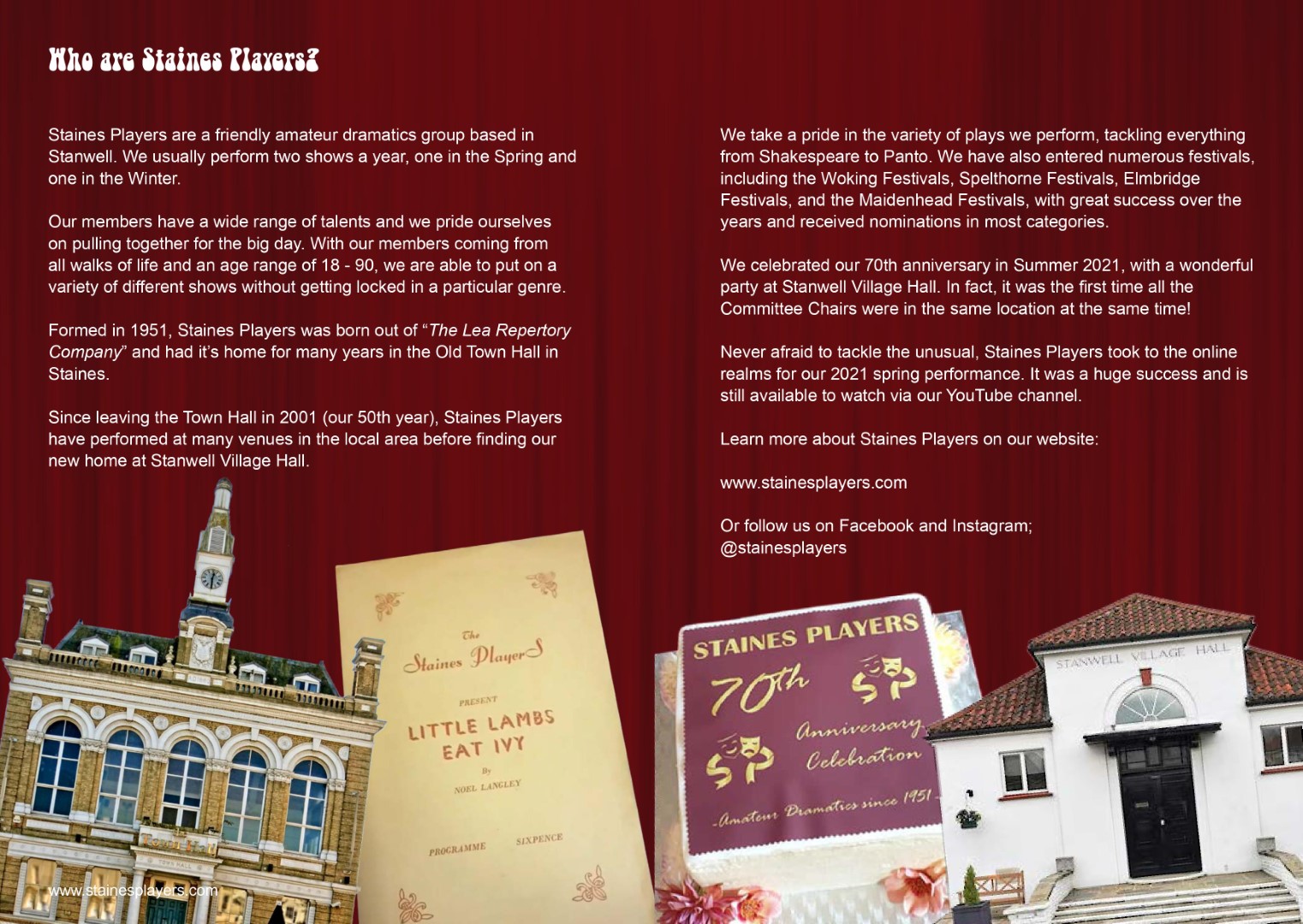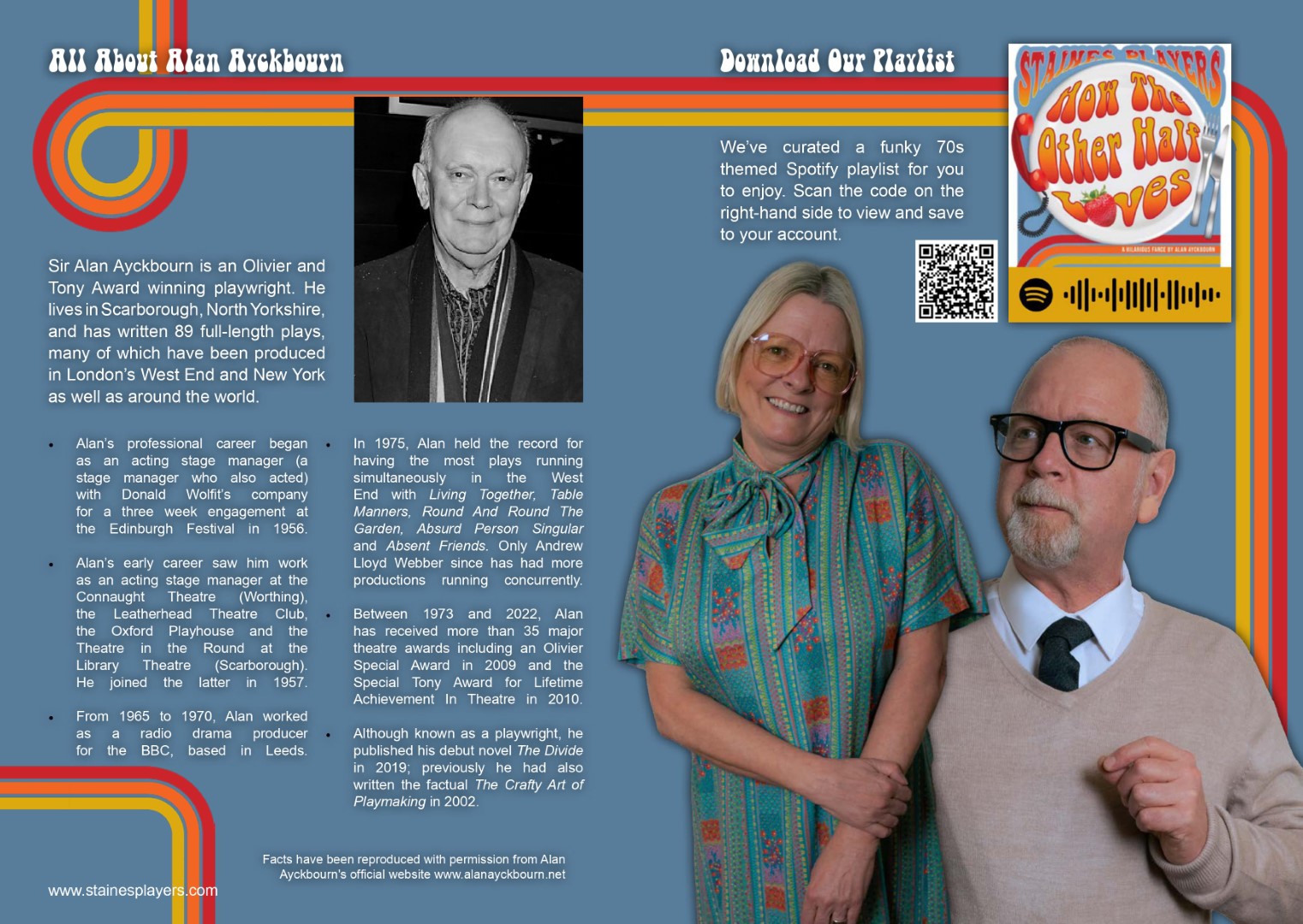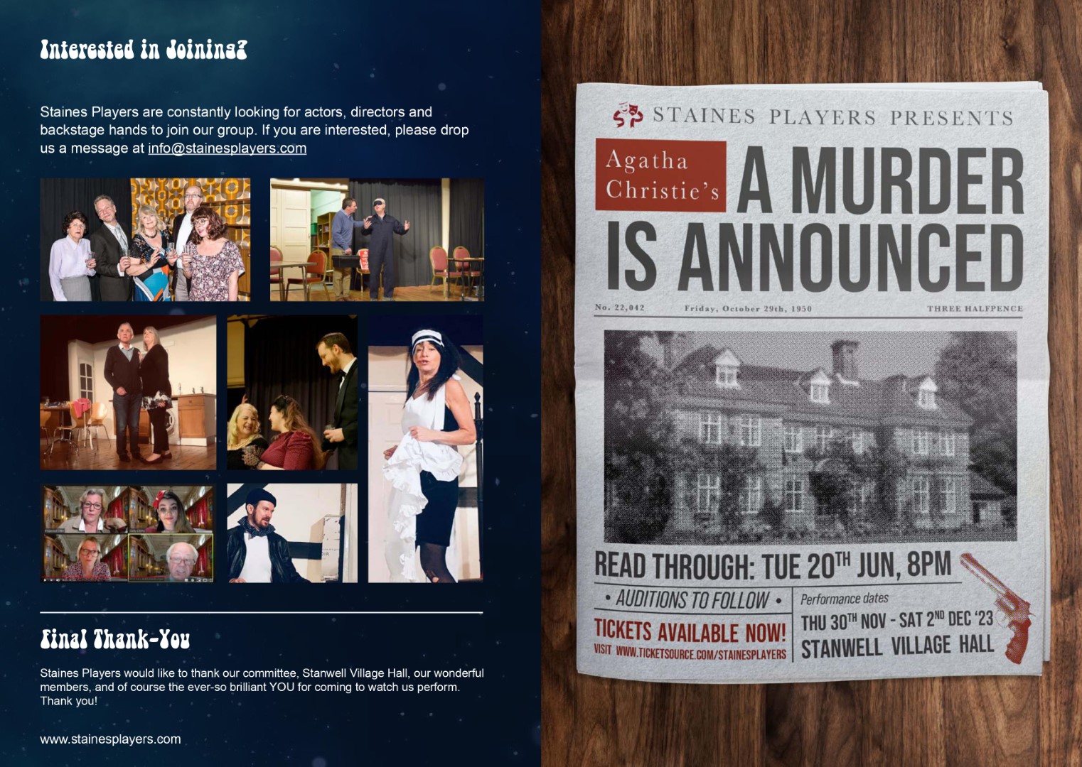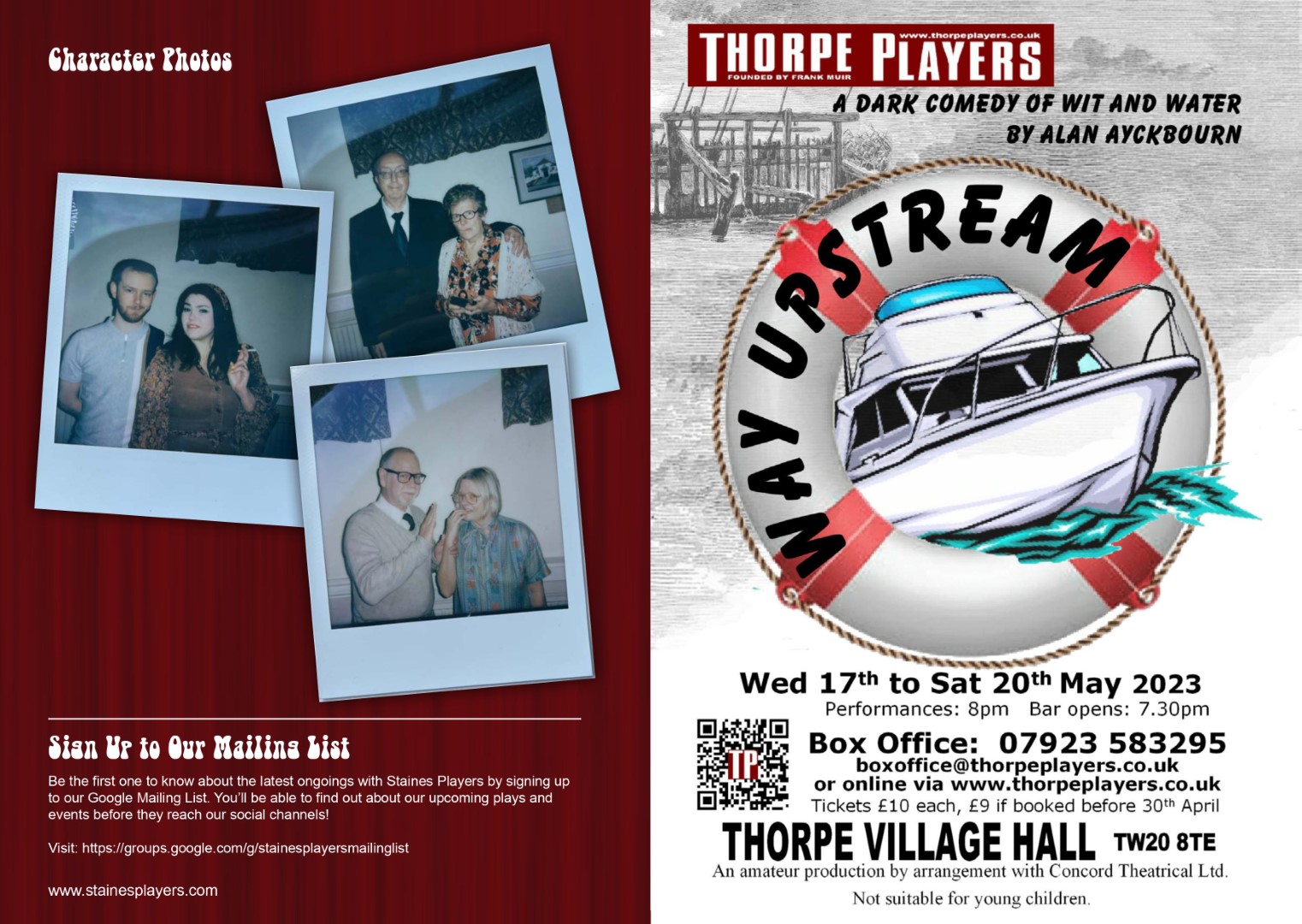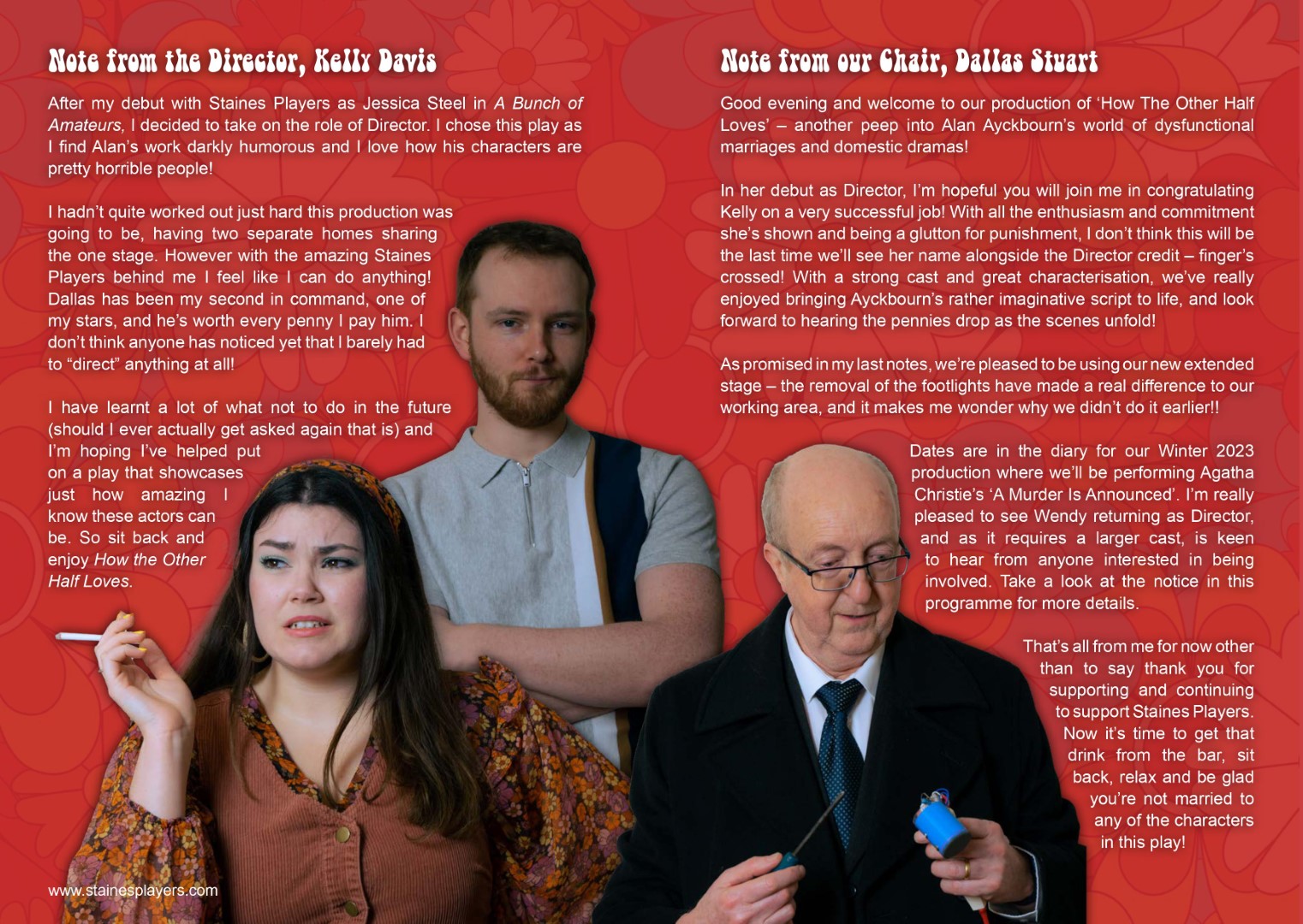 A hilarious farce by Alan Ayckbourn Three couples. Two dining rooms. One big mess. Alan Ayckbourn’s classic comedy takes us into a chaotic world of dysfunctional marriages, domestic drama, and infidelity. The lives of three couples frantically intertwine in this classic Ayckbourn comedy of confusion and chaos. When one of the women arrives home suspiciously late one night, a chain of events unfolds drawing each of the couples ever deeper into hilarious misunderstanding. Cast and Crew Frank Foster - Des Cann Fiona Foster - Madalyn Brooks Bob Phillips - James Henry Teresa Phillips - Sofia Angulatta William Featherstone - Dallas Stuart Mary Featherstone - Amanda Stuart Director - Kelly Davis Stage Manager - Lynne Percival Assistant Stage Manager - Val Clayton Prompt - Geoff Meddleton & Kelly Davis Technical - Sam Brooks Front of House & Backstage - Anna Mcalaney, Matt McAlaney, Wendy Cann, John Rudderham, Rosalyn Young, Jane Ferre, Maureen Frost Graphic Design - Sofia Angulatta Special thanks - Salisbury Theatre, Stanwell Events, Rhys Angulatta, Liz Argent, Samuel French, Concord Theatricals |