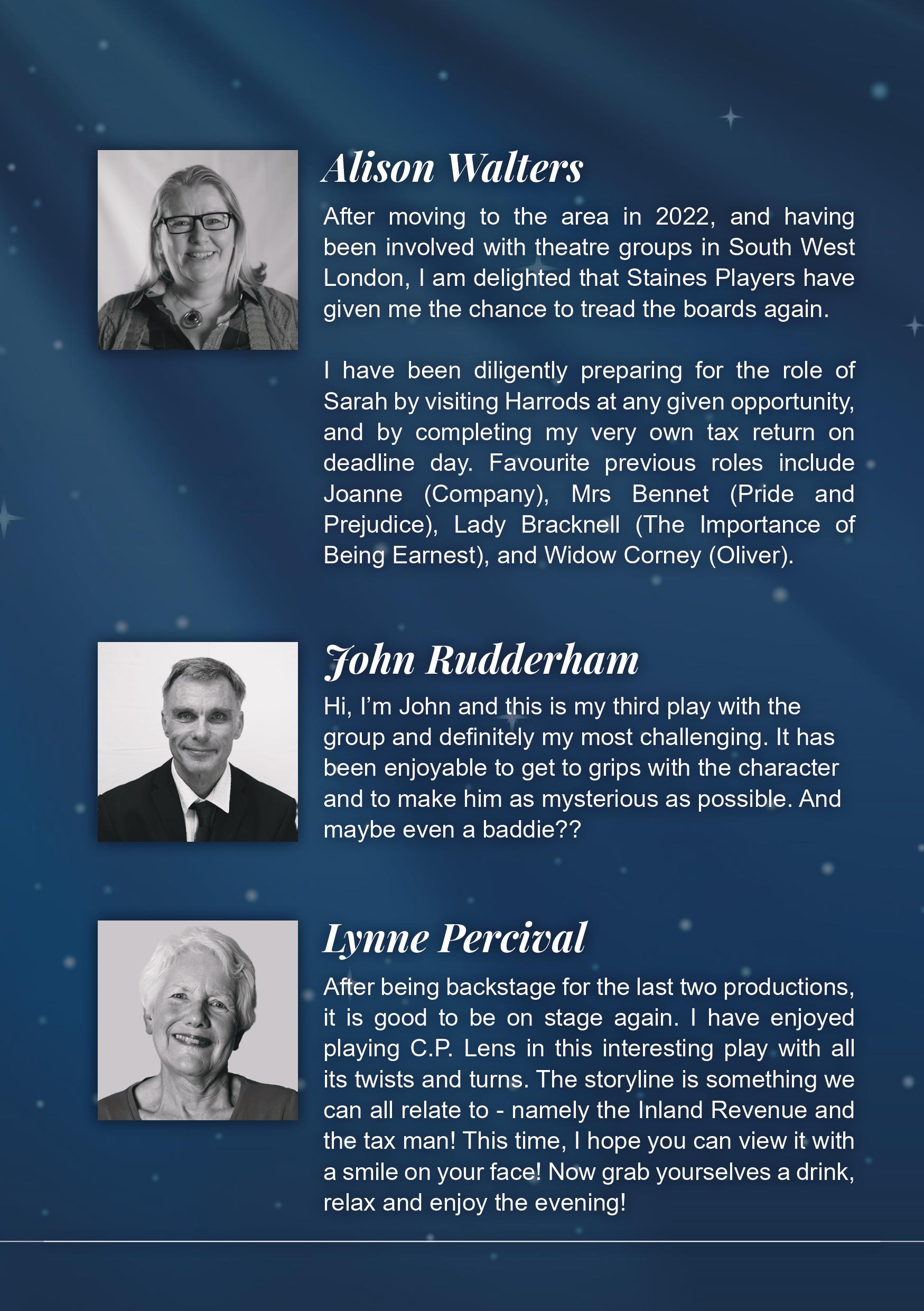 A comedy by Donald Churchill and Peter Yeldham When Tom Lambert, botanist and TV gardening personality, receives a call from Inland Revenue enquiring about his public relations consultant Joanna Flint, he can honestly say he has never heard of her. By lunchtime, he knows all about Miss Flint: his accountant and ex wife confesses that she invented Miss Flint as a tax dodge. This tricky situation sets the stage for sparkling comedy. Cast and Crew Tom Lambert - Dallas Stuart Lucy - Kelly Davis Albert - Tal Lyth Sarah - Alison Walters Mr Dodds - John Rudderham C.P. Lens - Lynne Percival Director - Rosalyn Young Assistant Director - Roger Simmons Stage Manager - Val Clayton Prompt - Geoff Meddleton Technical - Sam Brooks Graphic Design - Sofia Angulatta Front of House & Bar - Madalyn Brooks, Maureen Frost, Amanda Stuart, Anna Mcalaney, Jane Ferre |